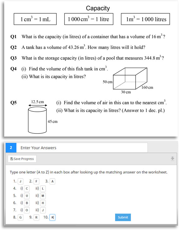 After completing the questions, the learner enters their answers, specifying the letter that corresponds with each answer. Instant feedback is then given. Once the lesson is passed, or if the pass rate has not been reached within a specified number of attempts, printable worked solutions are made available to help identify errors.
